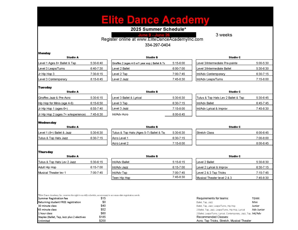 Level 1 & 2 Ballet/Jazz combo Grades 5th and up Levels 2 Ballet/Jazz/Tap - Minimum 2 years experience/skills Levels 3 Ballet/Jazz/Tap - Minimum 3/4 years experience/skills Intermediate/Advanced - Minimum 4 years experience/skills Jr Hip Hop 1 Jr Hip Hop 2 - 3 Jr Hip Hop Int Teen Hip Hop Acro 1 - No previous experience Acro 2 - Minimum skills: cartwheel, headstand, handstand, forward roll, straddle roll, bridge Int/Adv Acro - Minimum skills: one-handed cartwheels, limbers, walkovers, roundoff, working on intermediate skills such as back handsprings, aerials (front/side), chest stands, chin stands, half moon walkover, Valdez, and more. Lyrical 1/2 - Min. age 6 | Ages 7+ with 0-2 years training. Completed 2 years or Tutus Level 2 with skills mastered. Completed 3 years past age 5; skills mastered/approved by Director. Completed 4+ years past age 6; skills mastered/approved by Director. Minimum Age 6. Minimum Age 7 Minimum 2 years Hip Hop, Age 8+ Minimum Age 11. Minimum Age 7. |